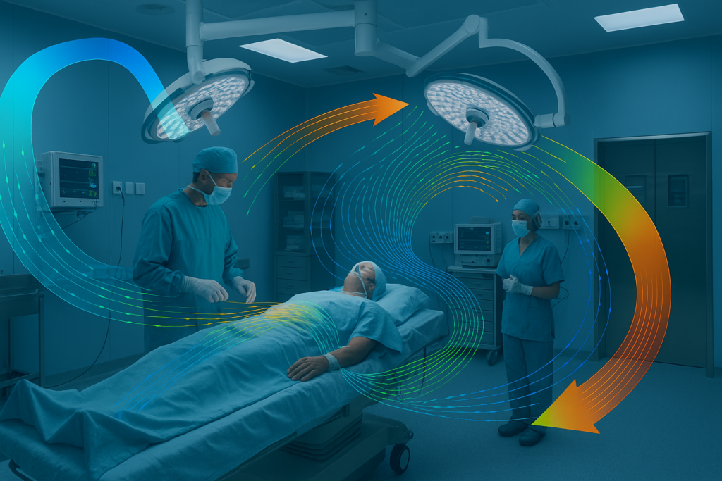 Advanced CFD simulations analyze airflow patterns in sterile operation theatres, model laminar and turbulent flows, evaluate air curtain efficiency, and study particle dispersion to enhance contamination control and indoor air safety.